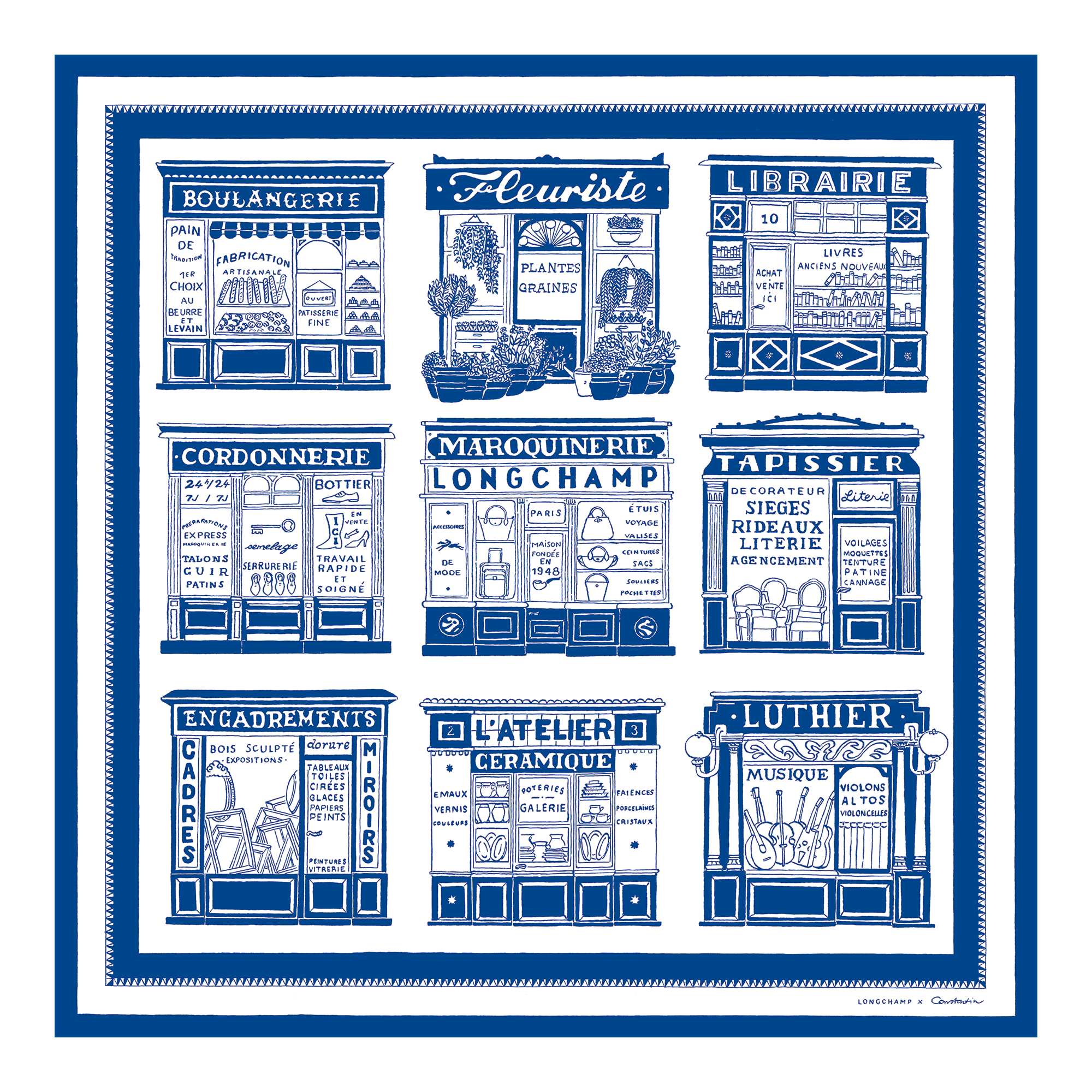 Longchamp, mavi engobe motifli el yapımı seramikleri ve illüstrasyonlarıyla tanınan sanatçı Constantin Riant ile iş birliği yaparak, Paris’i şekillendiren zanaatkârlara saygı duruşunda bulunuyor. Bu ipek fular, çerçevecilerden çiçekçilere, fırıncılardan kemancılara, kitapçılardan deri ustalarına, seramikçilere, döşemecilere ve kunduracılara kadar geleneksel Paris zanaatlarını vurgular.